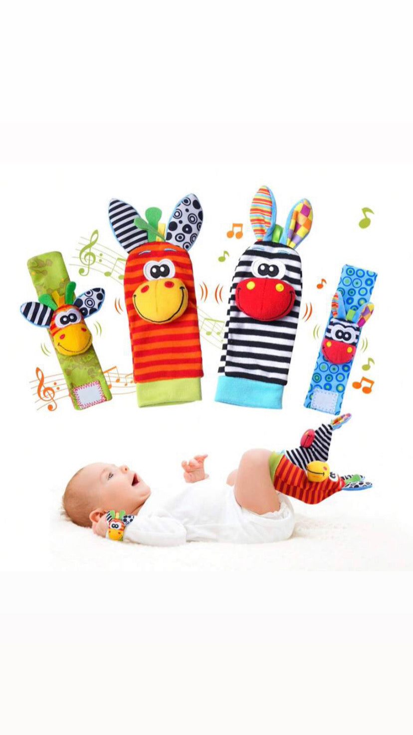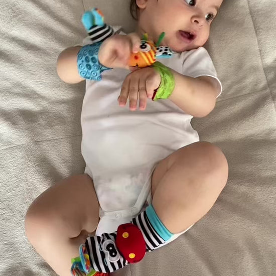 Ver a tu bebé descubrir el mundo con ternura y alegría... no tiene precio. Estos adorables juguetes sensoriales están diseñados para envolver las muñecas y pies del bebé de forma cómoda y segura, estimulando su desarrollo desde los primeros días.